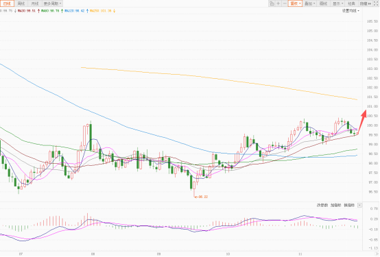 欧元兑美元价格从前期1.0177的新低开始筑底反弹,一路震荡上涨,目前欧元对美元整体全部运行在MA250日均线上方,呈明显的多头趋势。日内短线行情则建议看多震荡上涨的走势。